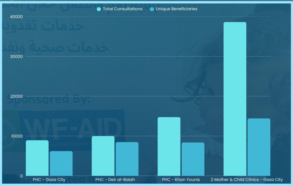 In total, the facilities recorded 117 days of operation: the Primary Health Centres operated for 27 days in Gaza City, 33 days in Deir al-Balah, and 33 days in Khan Younis, while the two Mother and Child Clinics in Gaza City operated for 24 days each.