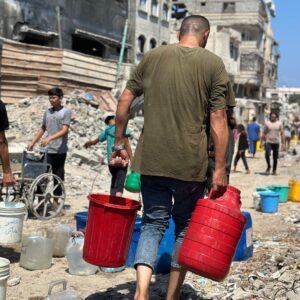 Every day, water trucks deliver life-saving supplies of clean, desalinated water across Khan Younis and Deir al-Balah. Drawn from local wells and purified to make it safe for consumption, the water reaches camps where displaced families fill jerry cans and containers to meet their essential needs.